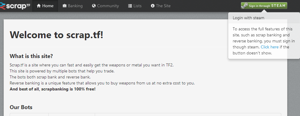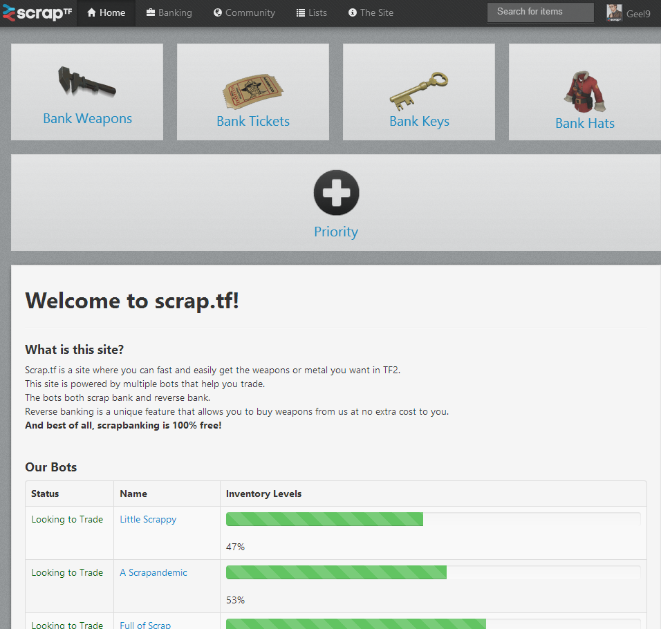 How to do scrap banking! To put it simple scrap.tf is an automated banking site that changes the way you trade this is an automated trading website that helps everyone in team fortress ever wondered how to find good unusuals on scrap.tf's unusual bot? Only use this popup to accept them. I will simplify scrap banking to the point where a newbie who never played tf2 will understand. We allow users to scrapbank and reverse bank at the same rate, 1 scrap per two weapons. How to do scrap banking! Easy free items with scrap.tf!!! Turn your extra weapons into metal with the click of a button. (default 180) displays a text message alerting users of the !scrapbank command every x seconds. I recorded this about 2 weeks ago but forgot to upload it xd. The basis of the games are very different, too, a huge part of overwatch is using abilties effectively and with good timing, this is very different to how it is in tf2. The bot will buy 2 weapons for 1 scrap, and it'll sale 2 weapons for 1 scrap. And for more information on how the bot works, add the bot and then chat 'help'.